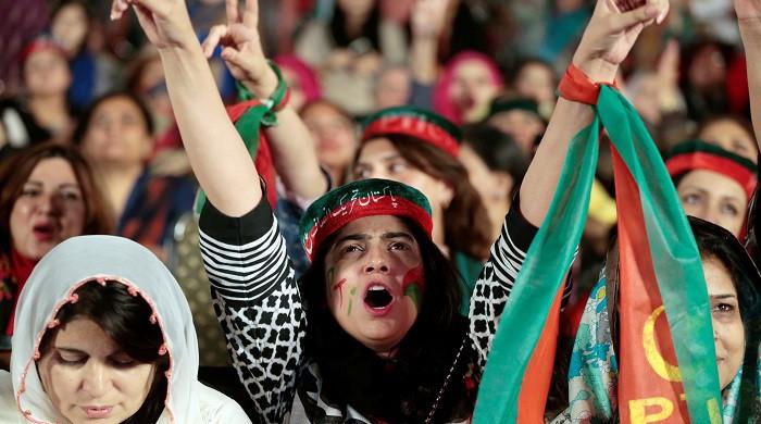 Supporters of Imran Khan gesture to party songs in this undated photo. — Online