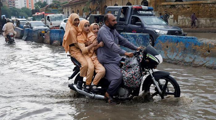 A man and students ride on a motorcycle on a flooded road, following rains during the monsoon season in Karachi, August 10, 2022. — Reuters