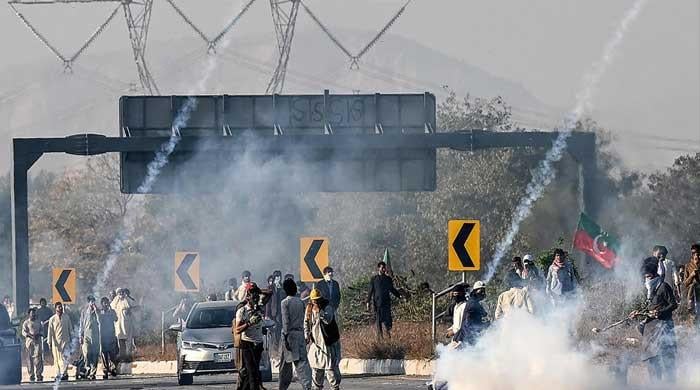 PTI workers attempt to throw back teargas shells fired by riot police as they protest during a march to Islamabad on November 25, 2024. — AFPViolent "vanguards" worked under Murad Saeed, says ministry.Miscreants comprised of about 1500 hard core fighters, it adds.Group "attacked"...from GEO NEWS - Pakistan https://ift.tt/m1nNV4u
