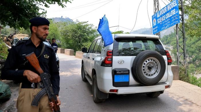 A police officer stands guard as a team of UN arrives to visit the Bilal Mosque after it was hit by an Indian strike in Muzaffarabad, the capital of Azad Jammu and Kashmir, on May 7, 2025. —Reuters